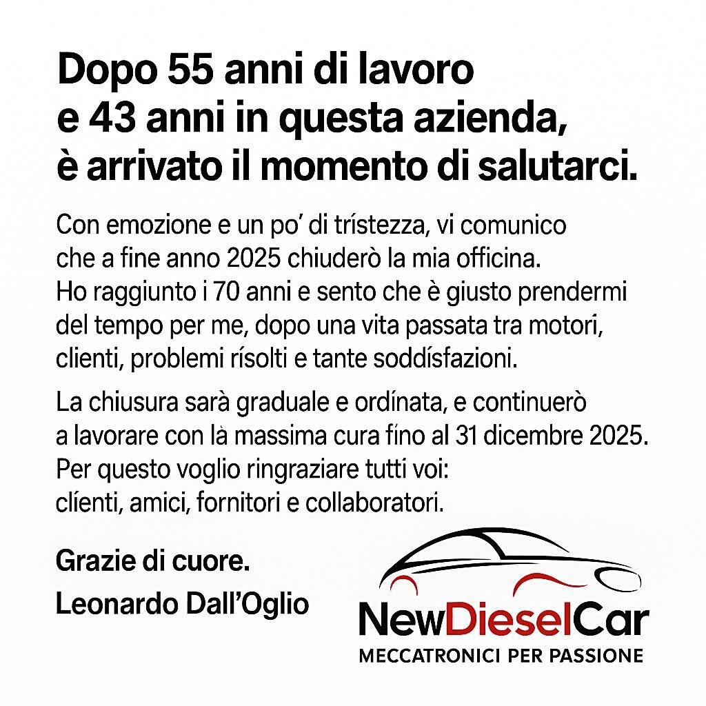 Ho raggiunto i 70 anni e sento che è giusto prendermi del tempo per me, dopo una vita passata tra motori, clienti, problemi risolti e tante soddisfazioni.